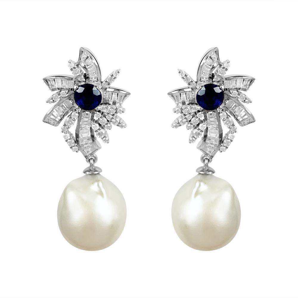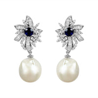 Flower Baguette Diamond & Blue Sapphire with Pearl Earrings